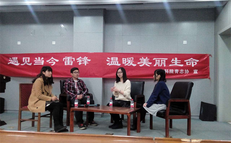 2015年3月8日,“遇见当今雷锋,温暖美丽生命”主题系列活动交流会在生物战报告厅成功落幕。出席本次交流会的嘉宾有南开大学青年志愿者协会执行主席倪永硕,生命科学学院团总支书记吴一荻、副书记石欢,志愿服务与社会实践中心主任陈�清担任主持。