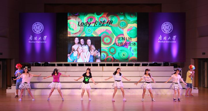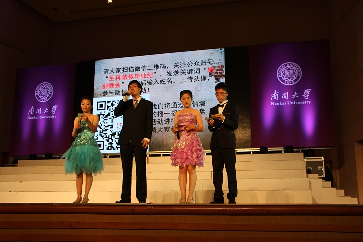 在精彩纷呈的节目中间,还穿插着一些互动小游戏,打破了传统晚会台上台下的距离,真正实现了全民参与。残酷而有趣的指压板游戏,考验班级协作的“七拼八凑”,考验反应能力的“正话反说”,还有考验南开四年对于南开知识的了解的“答非所问”,都在全场掀起了一个又一个小高潮。最终生科二班凭借出色的表现力拔头筹,获得了积分游戏的冠军。在晚会的最后,还播放了大学四年曾经给予我们学术上指导的各位老师和教授的寄语视频,同时以照片和视频回顾了我们的这四年。