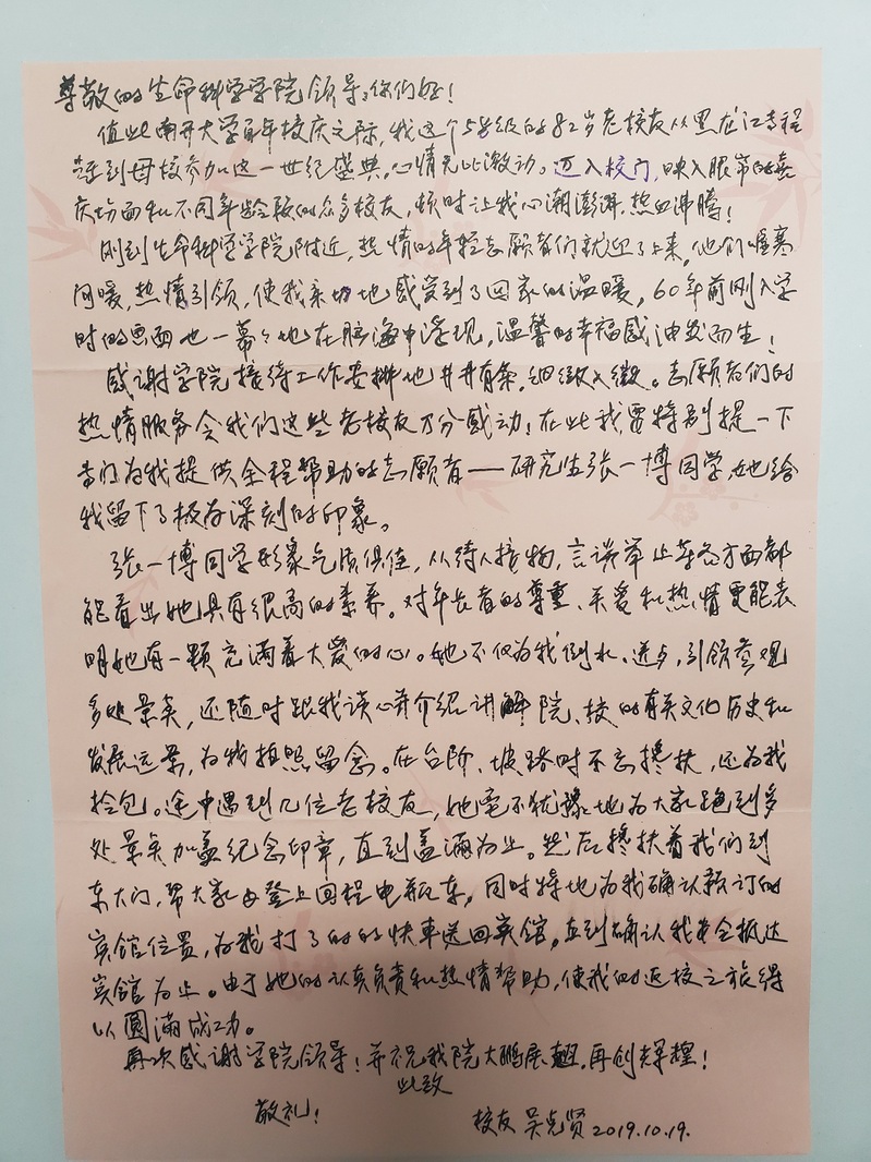 志愿者们用热心,耐心和细心使得校友们感受到了回家的温暖。这不,58级老学长吴克贤先生给学院发来了感谢信,感谢我们学院的接待工作井井有条。