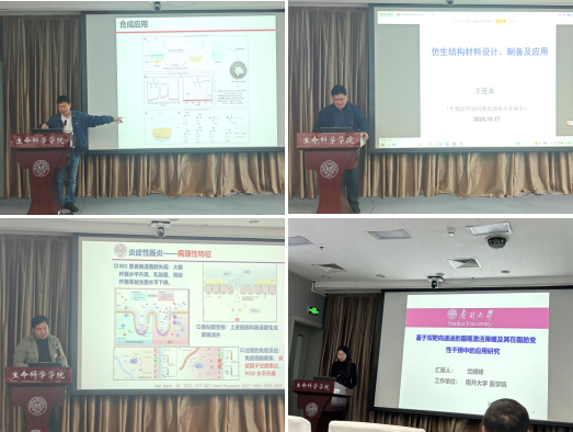 在组织与细胞工程论坛阶段,杨志谋教授主持,南开大学医学院漆智教授作“CADM1+ 肿瘤相关成纤维细胞通过RSPO2介导的RNF43/EPHA4激活胃肠间质瘤促进 EMT导致伊马替尼耐药的分子机制”的学术报告。庄洁、张凯旋、兰婷婷三位老师分别从线粒体靶向纳米酶调控心脏缺血再灌注损伤、下肢骨折复位与固定的生物力学机制、基于双靶向递送的脂噬激活策略及其在脂肪变性干预中的应用等方面分享了各自的研究成果。在水凝胶论坛阶段,李宗金教授主持,三位骨干教师杨志谋、 王连永、史洋分别从多肽光催化剂 、医用止血海绵制备及功能研究、长双歧杆菌表面载药治疗炎症性肠炎方面介绍了的最新研究进展。