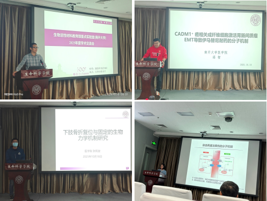 10月18日,生物活性材料教育部重点实验室2025年度学术研讨会在生命科学学院生物站报告厅举行,来自于重点实验室的近百名师生参加了会议,会议由教育部重点实验室主任杨志谋教授主持。会议伊始,杨志谋教授为会议致开幕辞。随后,生命科学学院副院长洪章勇教授致辞,希望重点实验室各课题组之间多交叉、加强团队之间的合作,为生科院的发展做出贡献;研究生应时刻做好科研准备,主动寻找机会多参与国内外的各种会议,锻炼自己的学术交流能力。