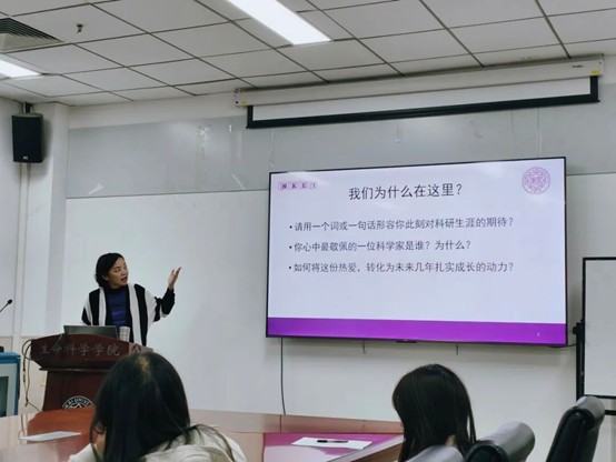 周卫红老师从“我们为什么在这里?”这一根本问题出发,引导同学们思考科研初心与科学家精神。周老师指出,科研是一场长跑而非冲刺,强调在研究生阶段要注重目标设定、时间管理与心理调适,培养持续专注与系统思维的能力。