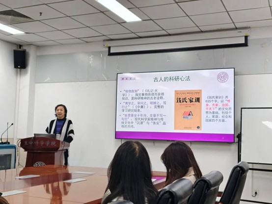 围绕“科研人的品格、能力与习惯”,周老师结合《礼记·大学》中的“格物致知”与《中庸》的“博学之,审问之,明辨之,笃行之”,阐释了传统文化与现代科研精神的契合。她特别强调,科研不仅是技术训练,更是一场精神修行,鼓励同学们将个人理想融入国家发展大局,胸怀“国之大者”。