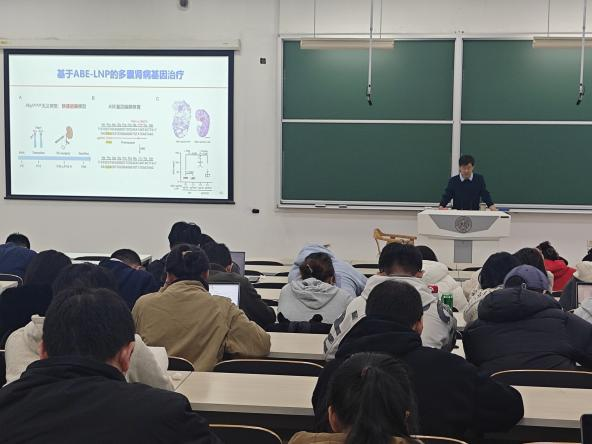 随后,陈宇鹏教授结合团队成果,解析了“从基础机制到转化医学”的实践逻辑。他聚焦临床缺乏干预手段的遗传性肾脏疾病(如成人显性多囊肾病),以cAMP信号通路为核心,借助蛋白质组学、单细胞多组学等技术,揭示了CRTC2以相分离形式促P-TEFb活化的分子机制,并阐明其核内聚集与疾病进程的关联性。面对自身不擅长的脂质体递送、蛋白提取等技术,他主动联合领域伙伴,构建了“机制研究-药物筛选-基因治疗”的交叉协作链,尤其在肾脏基因治疗中,通过筛选肾靶向LNP载体、优化ABE碱基编辑系统,成功在小鼠模型中实现CoL4a5基因修复,为遗传性肾病的临床转化提供了新路径。