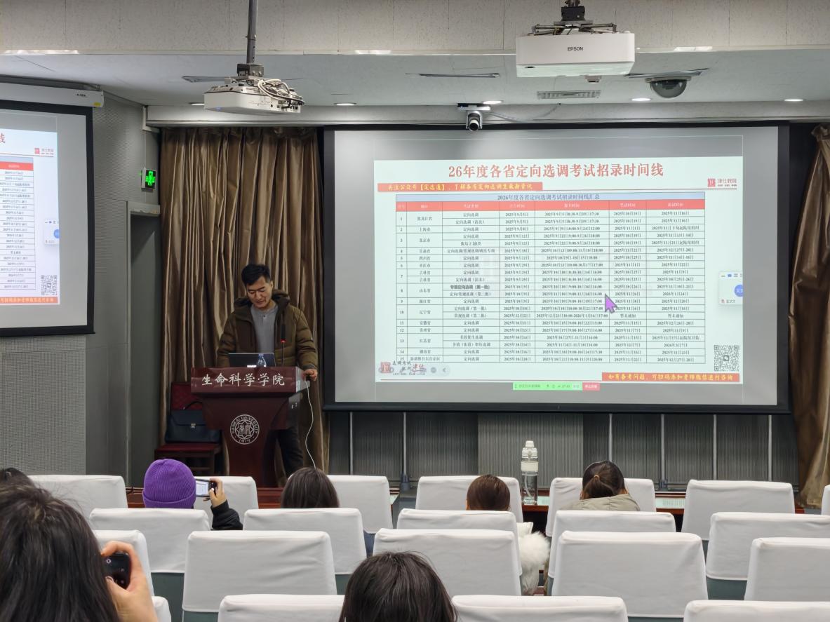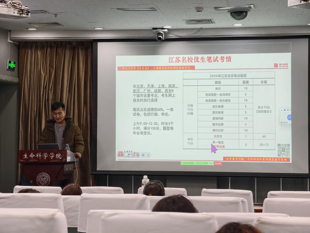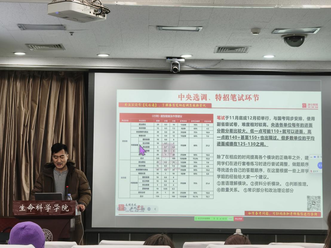 为帮助2027届毕业生精准把握公务员及选调生考试的最新政策,科学规划备考路径,我院于近日联合津仕教育成功举办“2027选调生公务员政策解读及备考指导”专题讲座。津仕教育王建群老师受邀主讲,通过公务员考试类型、各省定向选调最新政策等为广大学子建立起对公考体系的宏观认知,助力明晰备考方向。