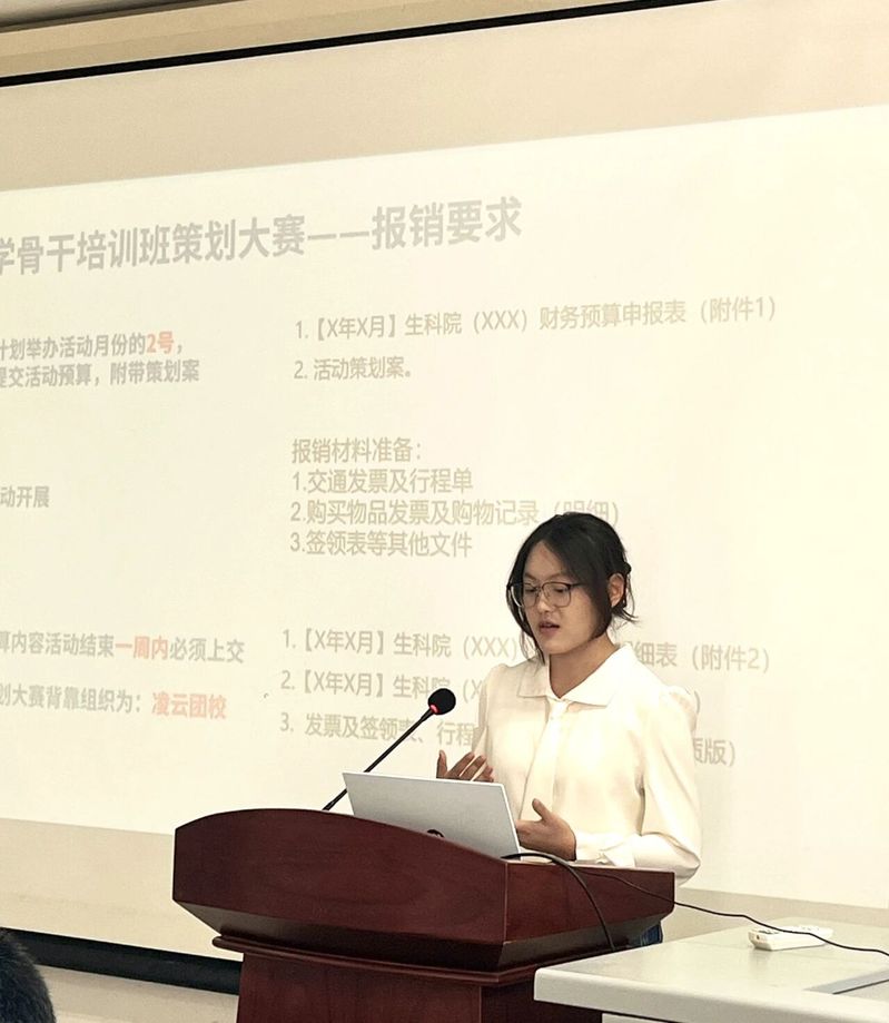 开班仪式结束后,团学骨干培训班第一课正式开讲。凌云团校副校长肖佳仪、金子谦分别围绕团学工作核心要求展开专题分享。肖佳仪以团学活动经费报销为主题,从预算申报、票据规范、材料提交等方向帮助学员厘清报销流程、规避常见问题,为后续团学活动规范开展筑牢基础。金子谦聚焦团学活动宣传工作规范,针对新闻稿撰写、新媒体推送制作与转存等全流程宣传技巧进行讲解,从而明确团学工作中宣传的标准,帮助学员更好完成策划大赛与团学工作中的宣传。