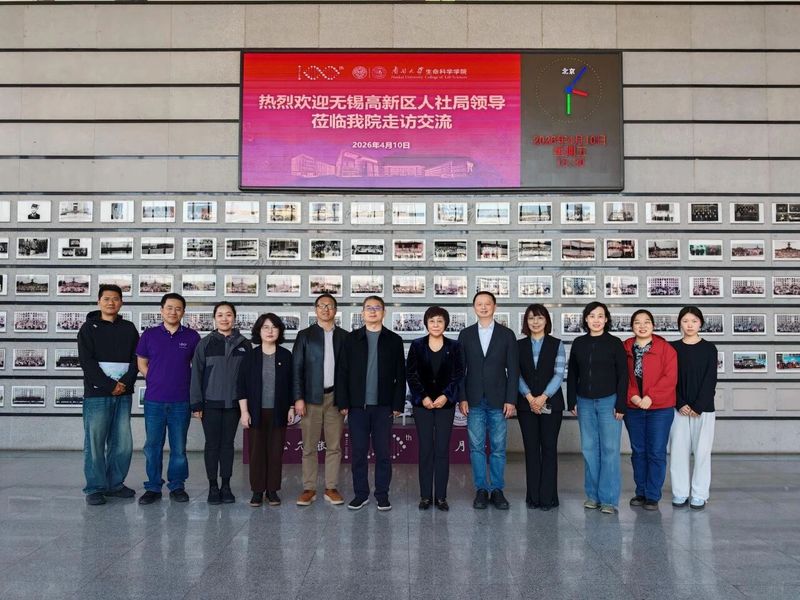 为深化校地产学研融合,推动人才供需精准对接,助力生命健康领域人才培养与产业发展同频共振,2026 年 4 月 10 日,无锡高新区人社局党组书记、局长孙昊带队到访南开大学生命科学学院,无锡高新区人社局党组成员、副局长张轶,区人力资源管理服务中心主任储霞、副主任王秋晨,高新人才集团董事长严茵,高新人才管理咨询有限公司总监陈敏一同参与调研。生命科学学院党委书记谢桂玲,党委副书记、副院长王兰,副院长洪章勇,教学培养办公室主任刘姣,双一流建设办公室主任杨哲,辅导员田晖在生物站A110会议室接待考察团一行,双方开展产学研人才合作座谈,共商校地合作新路径,探索生物医药产业人才发展新方向。
