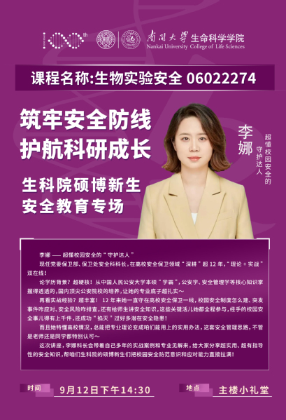 9 月 12 日下午,生命科学学院 2025 级研究生“生物实验安全”第二课正式开讲。学院特邀校学党委保卫处李娜...